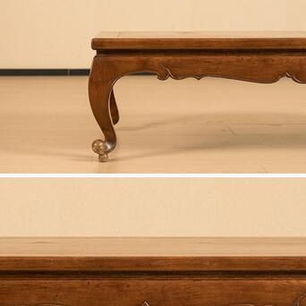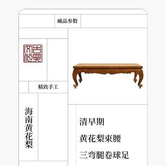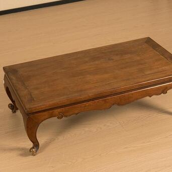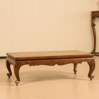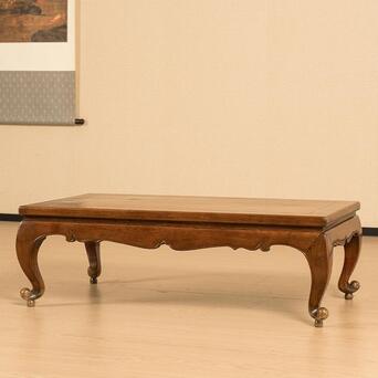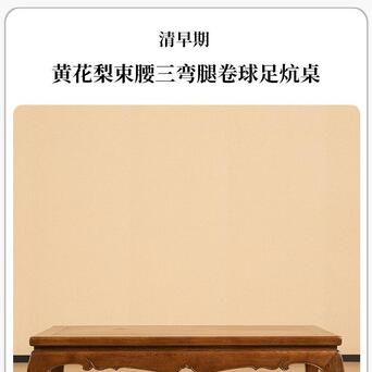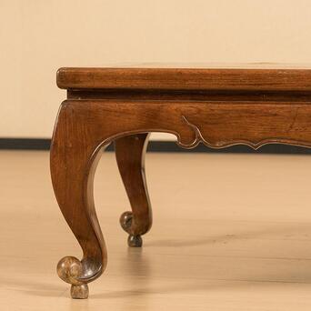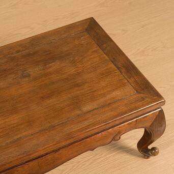 桌面下部束腰的设计独具匠心,窄束腰与牙板壸门形态相辅相成,形成了曲线与直线的和谐碰撞。阳线勾勒出的边缘线条清晰明朗,令整件炕桌更加精致而不失稳重。腿足采用三弯设计,曲线柔美高雅,既具稳固性,又不失纤细的艺术感。每一条腿足都亭亭玉立,摇曳生姿,带着一种轻盈的优雅。腿足底部向外翘起,翻卷成圆球形态,别具匠心的卷球足设计,在实用之余,更添一份动人之美。