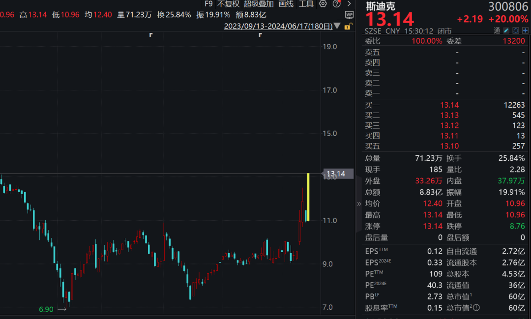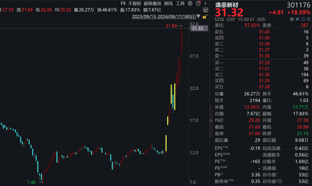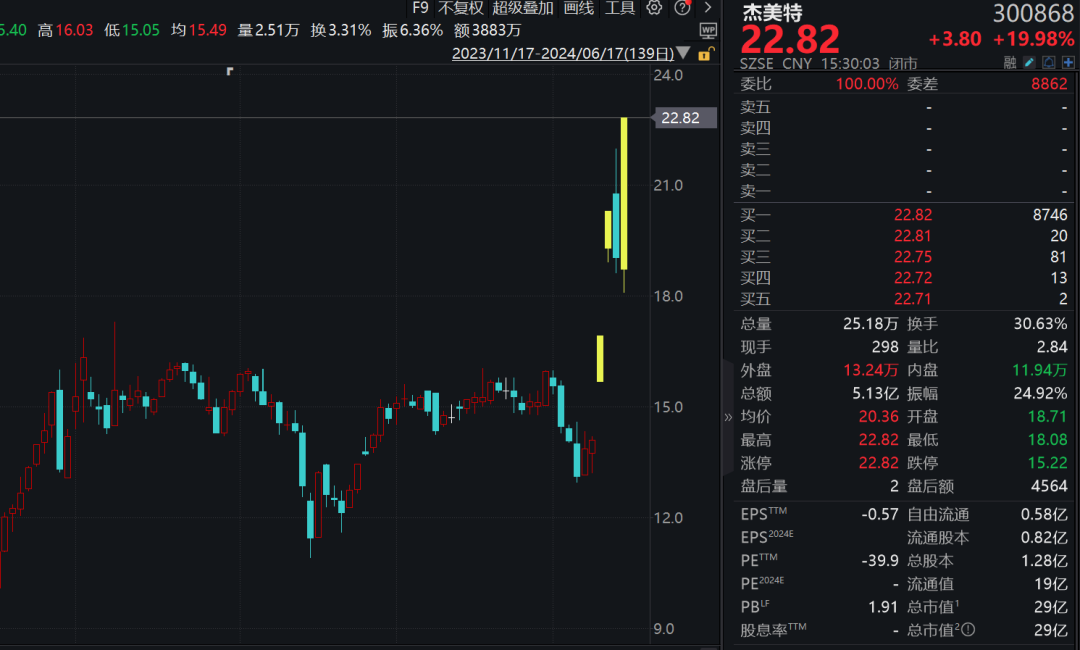个股掀起涨停潮,杰美特20%涨停,近4个交易日3度涨停,股价创年内新高;逸豪新材盘中一度触及20%涨停,6月以来累计暴涨155.88%;万祥科技,金禄电子等逾10股涨停或涨超10%。